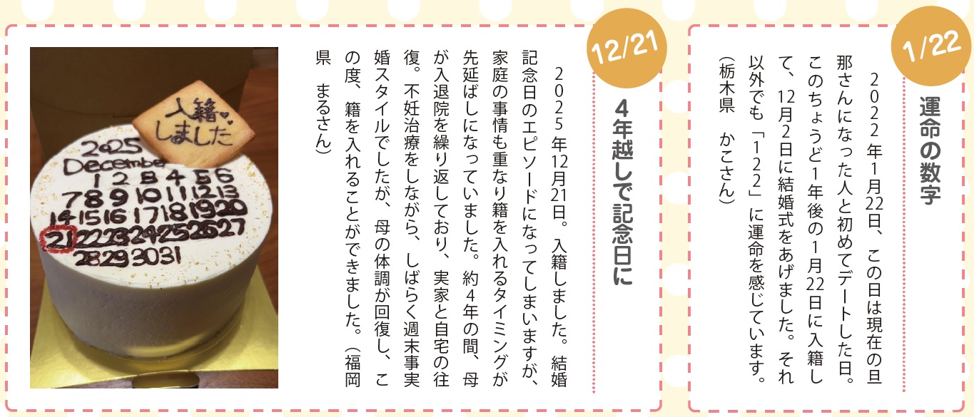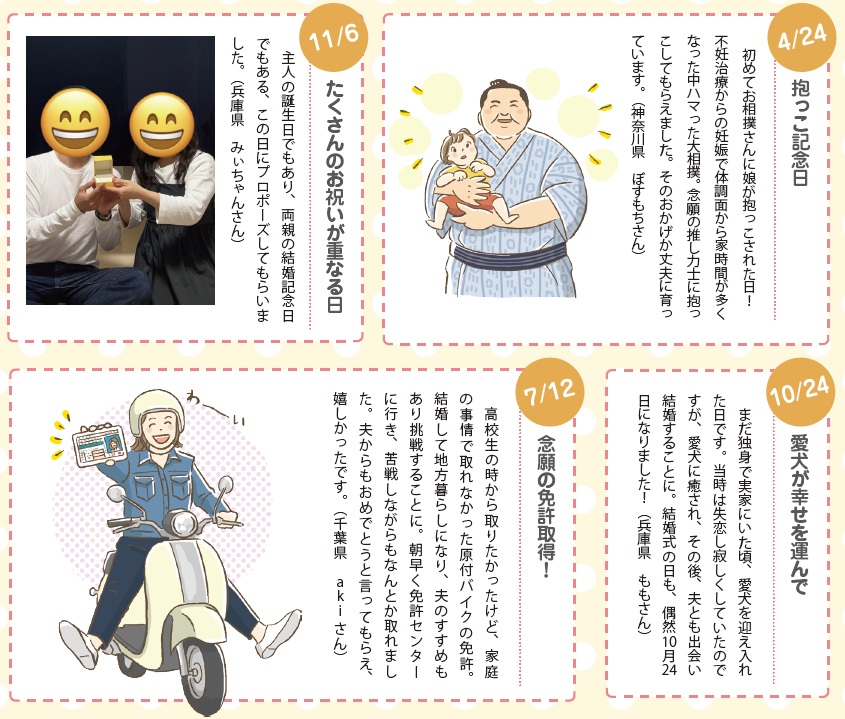 今回のテーマは「記念日」です。結婚・入籍記念日などの王道モノからちょっとレアで素敵な記念日自慢がたくさん集まりました!