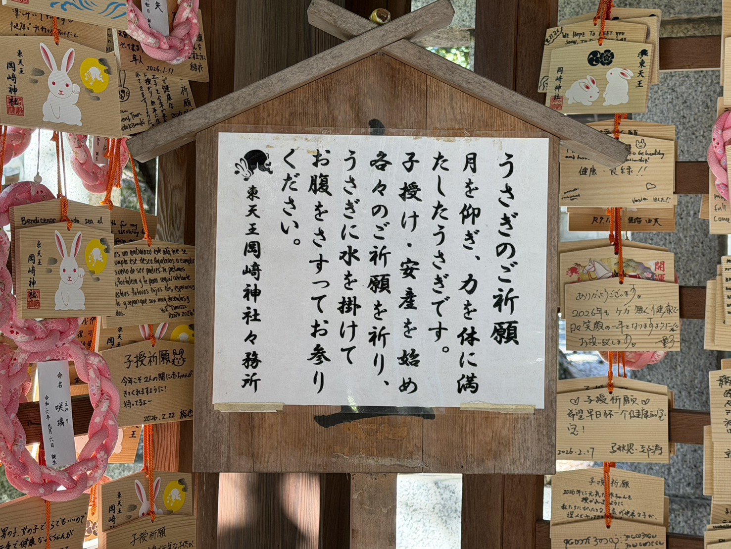 岡崎神社名物のうさぎみくじの容器を参拝者たちが並べたことで、こうなったそう。
