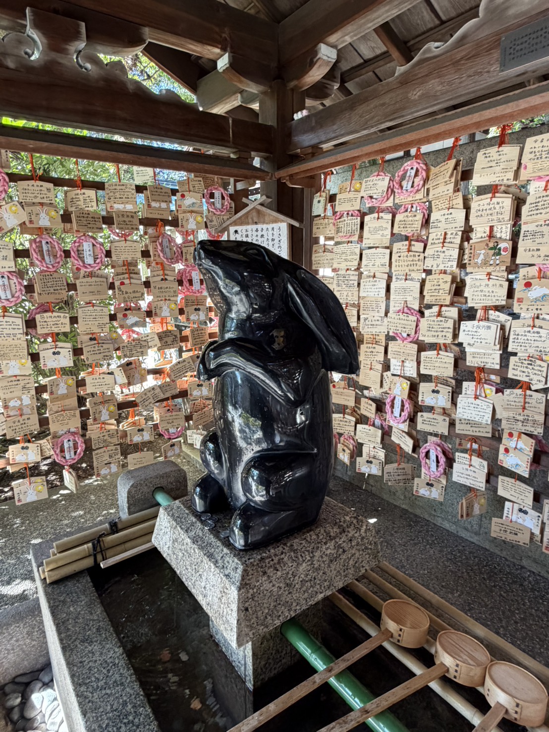 黒うさぎの像に水をかけて、お腹をさすりながら子宝祈願をしよう。