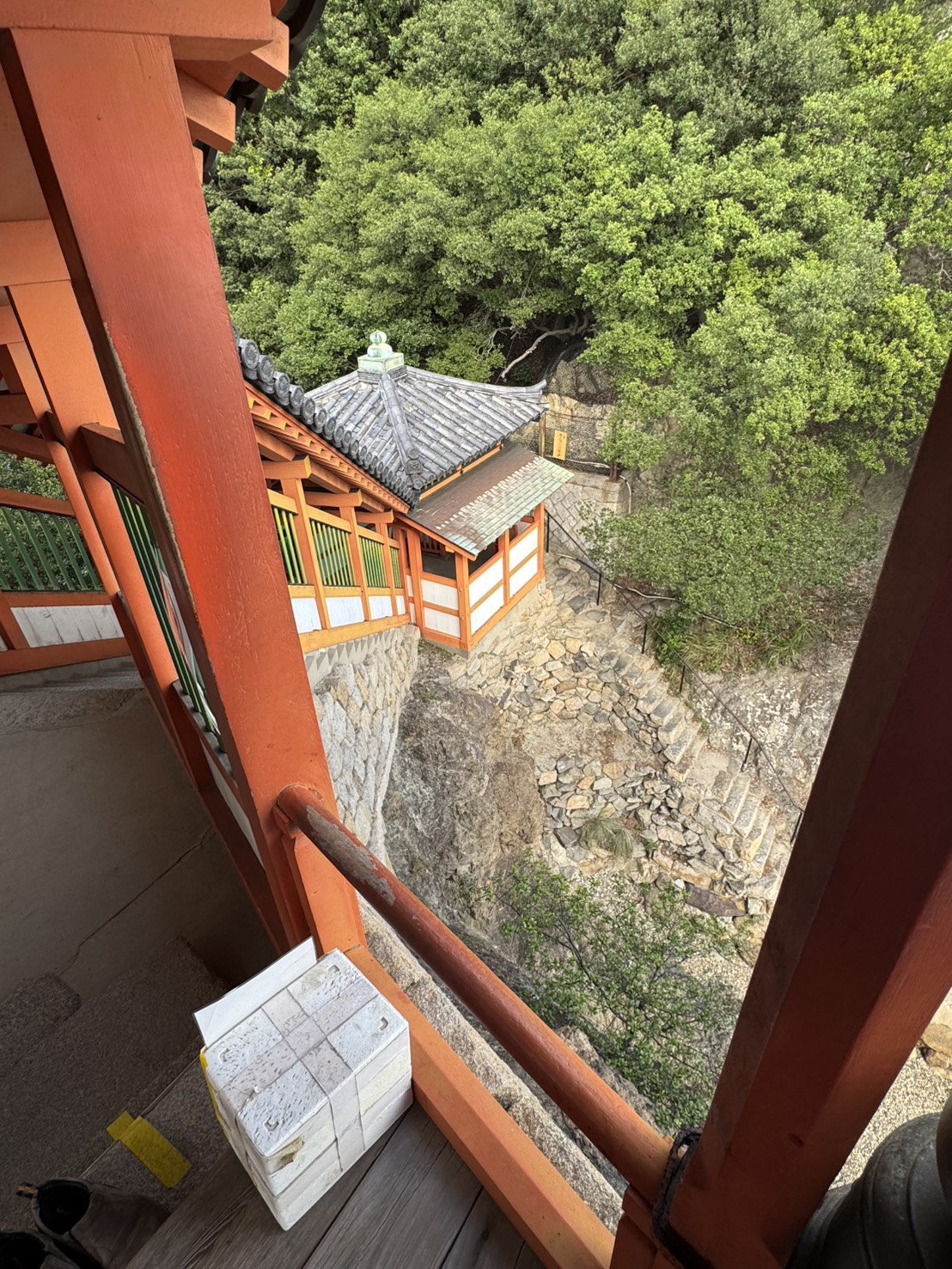 そこから観音堂へは、とても風情のある朱色の階段を昇っていくよ。ジブリの世界に迷い込んだみたいだ…