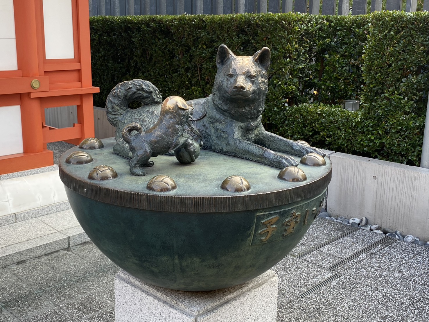 犬たちの頭を撫でるとご利益があると言われているから、みんなに沢山撫でられて、子犬の頭なんてつやっつや。